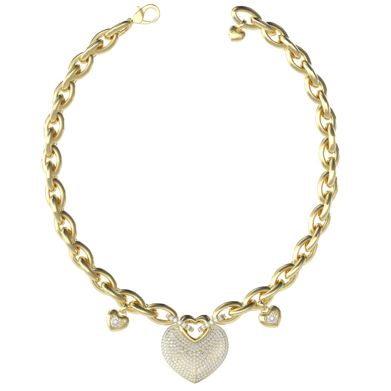 Mocny naszyjnik w typie łańcucha z trzema zawieszkami w kształcie serc - większą, wysadzaną drobnymi kryształkami oraz mniejszymi po obu jej stronach.