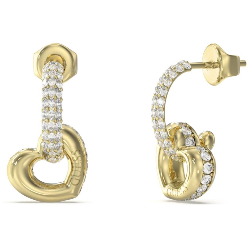 Złocone kolczyki koła zapinane na sztyft z kryształkami i wiszącymi sercami.
