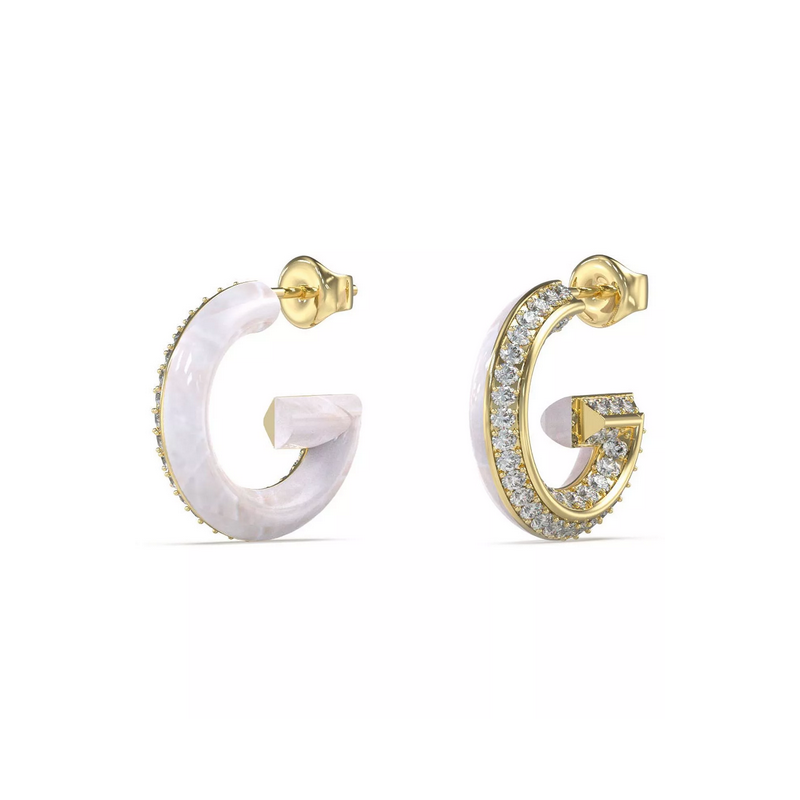 Kolczyki koła tworzące litery G w kolorze złotym z białą emalią i kryształkami.