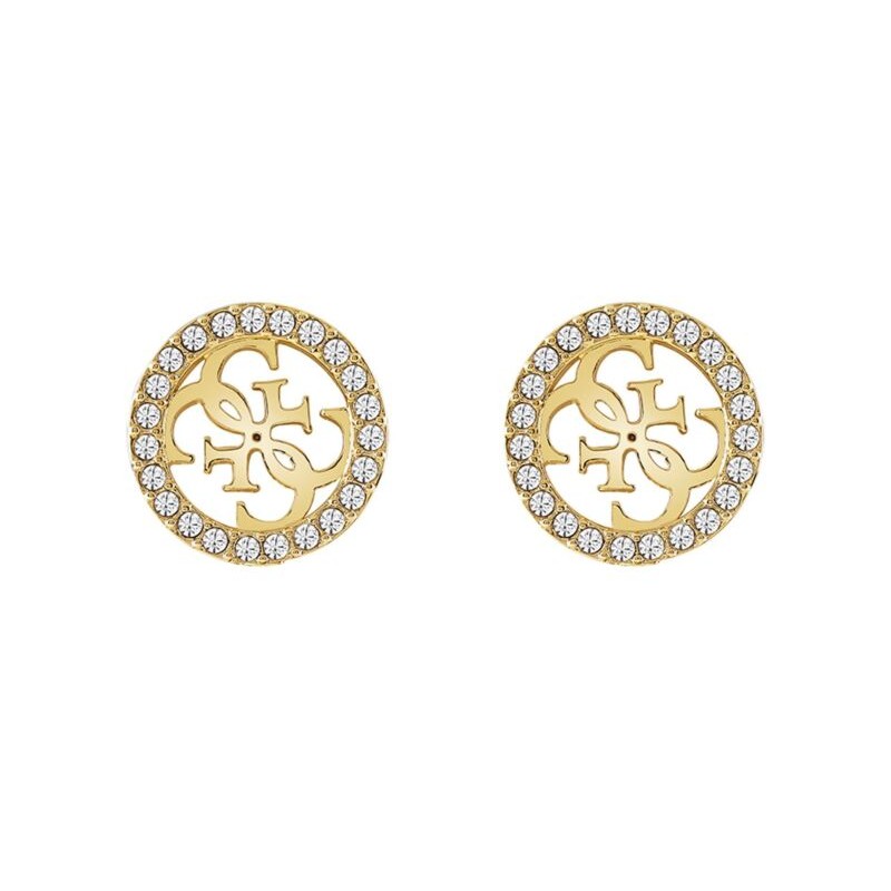 Kolczyki ze stali szlachetnej w kolorze złotym, zapinane na sztyft. Ich główne zdobienie stanowi logo marki, któremu blasku dodaje kryształowa aplikacja.