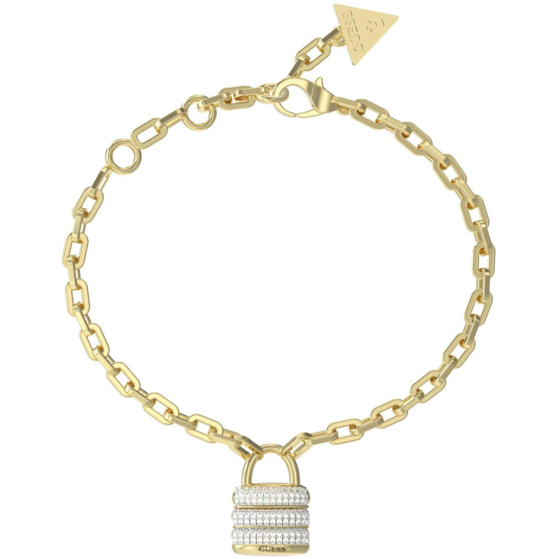 Złocona bransoletka o solidnym, łańcuchowym splocie z zawieszką w kształcie kłódki ozdobionej kryształkami.