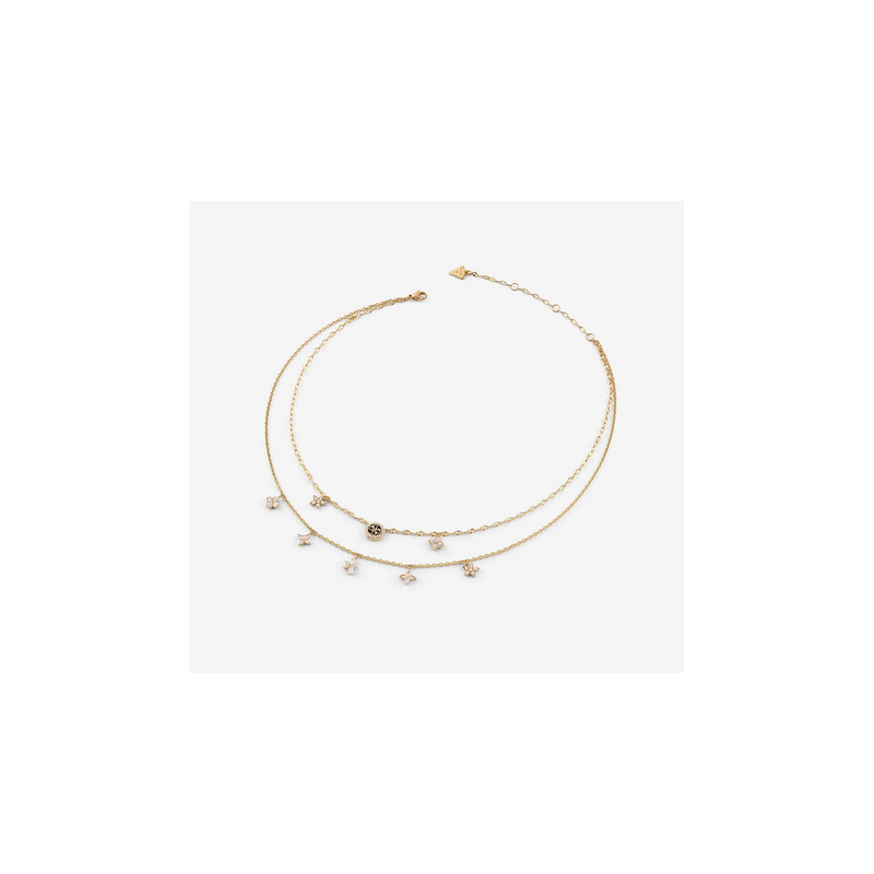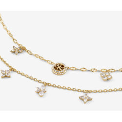 Podwójna celebrytka ze stali szlachetnej w kolorze złotym zdobiona wiszącymi błyszczącymi elementami o różnych kształtach.