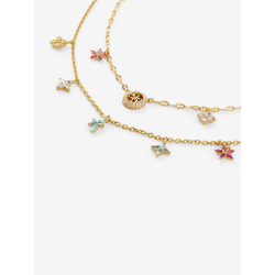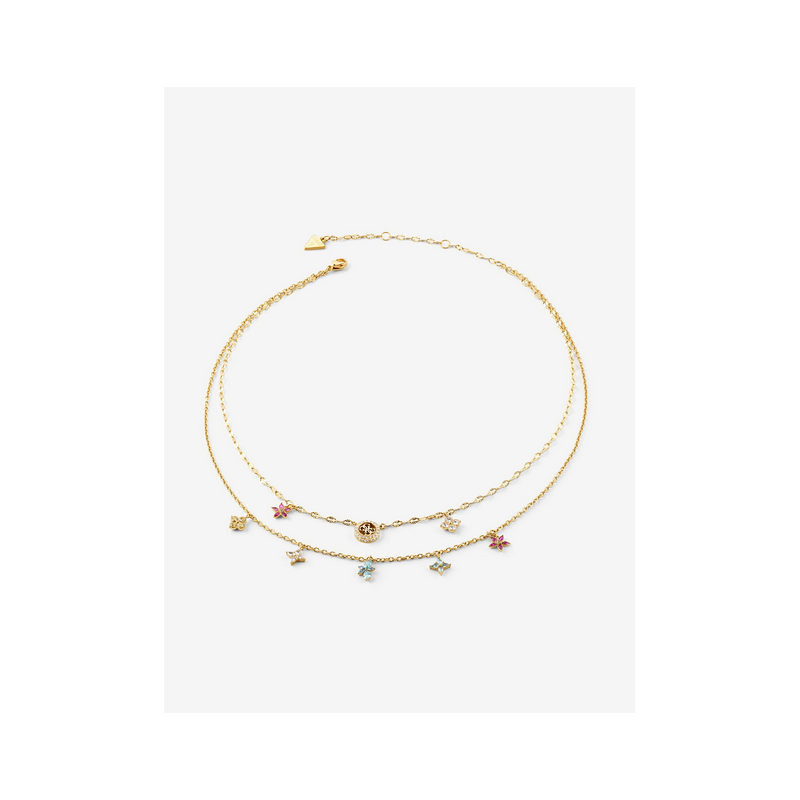 Podwójna celebrytka w kolorze złotym zdobiona błyszczącymi elementami o różnych kształtach i kolorach.