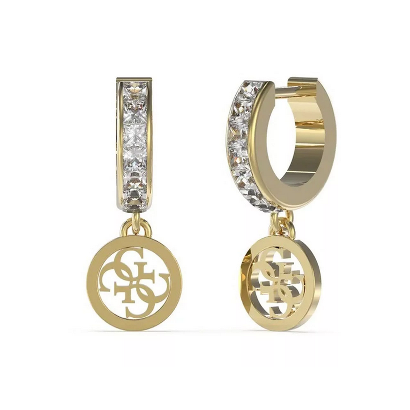 Kolczyki kółka z wiszącymi okręgami z logiem, wysadzane cyrkoniami.