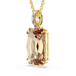 Długi naszyjnik w kolorze złotym z szampańskim, prostokątnym kryształem zawieszonym na uszku wysadzanym fioletowymi kamieniami.