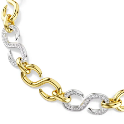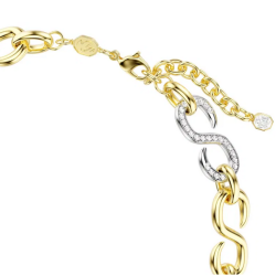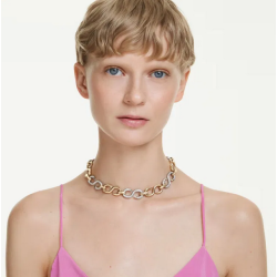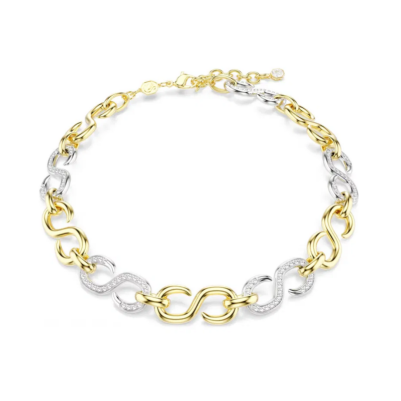 Nowoczesny naszyjnik łączący złoty i srebrny kolor stworzony z masywnych ogniw zdobionych kryształami.