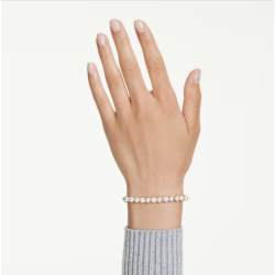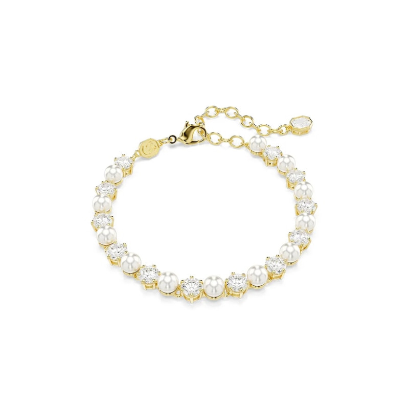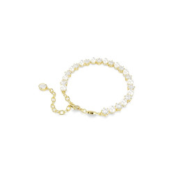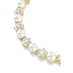 Elegancka bransoletka w kolorze złotym, zdobiona naprzemiennie jasnymi kryształami oraz perłami.