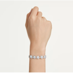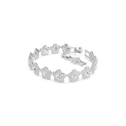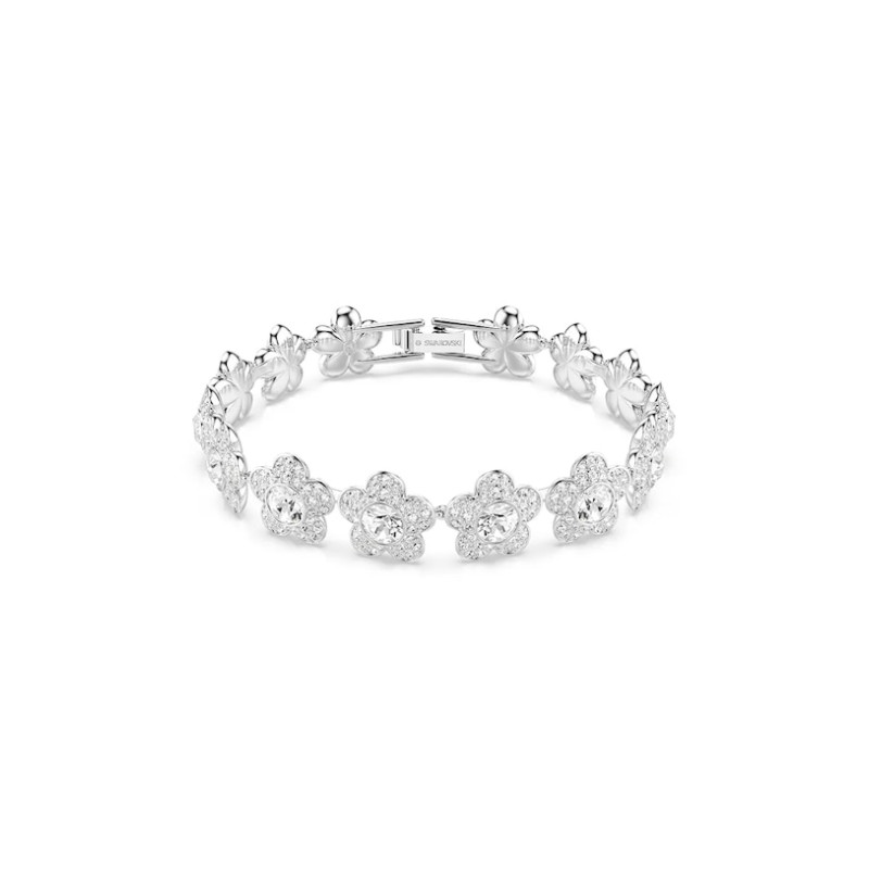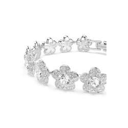 Efektowna bransoletka w kolorze srebrnym stworzona z rzędu kwiatów zdobionych kryształkami.