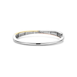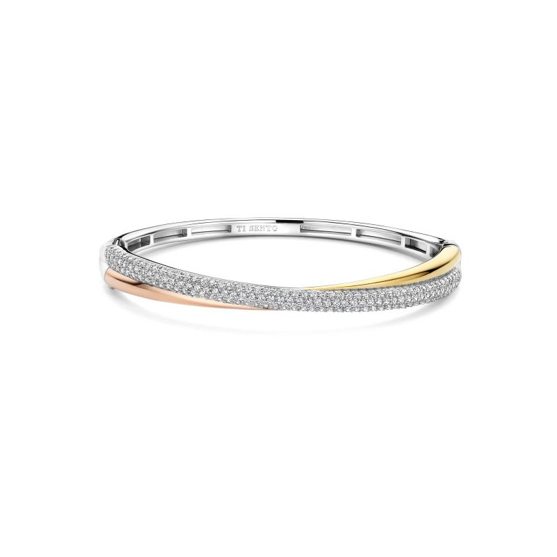 Sztywna bransoletka łącząca żółte i różowe złocenie oraz kryształową aplikację.