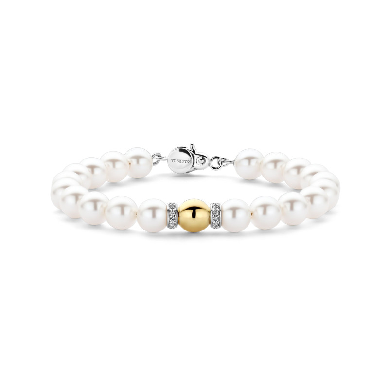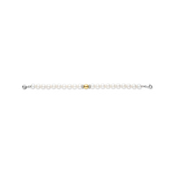 Bransoletka stworzona z rzędu pereł, zdobiona złoconą kuleczką i kryształkami.
