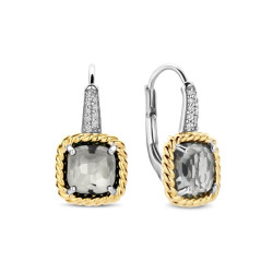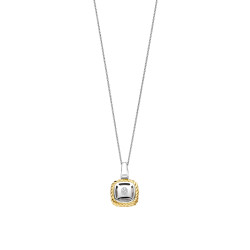 Efektowna zawieszka z kwadratowym, szarym kamieniem w złoconej obwódce.