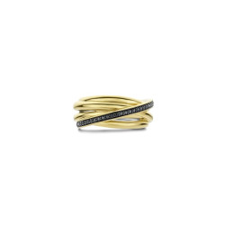 Pleciony pierścionek w kolorze złotym zdobiony paskiem z czarnych cyrkonii.